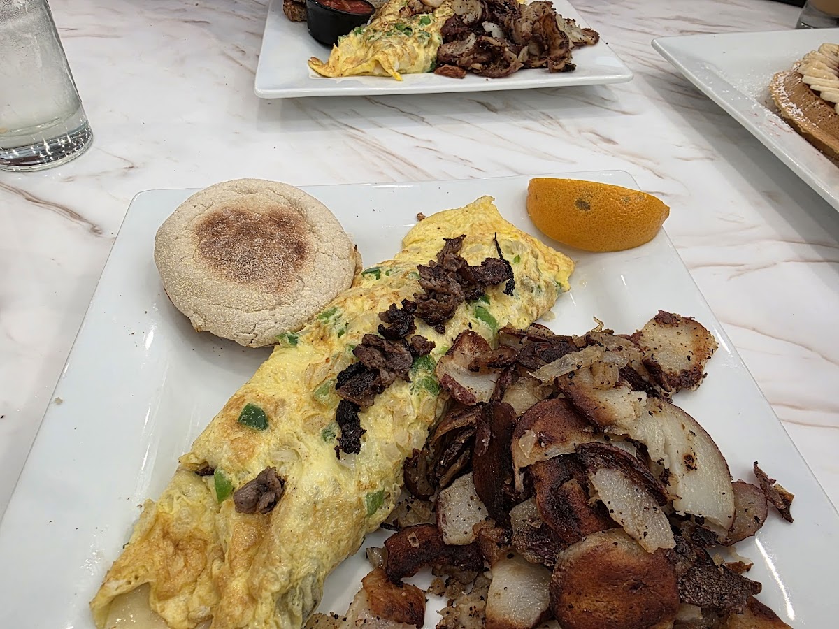 Cheese Steak Omelet - a hearty three-egg omelet with steak, peppers & onions, white American cheese.