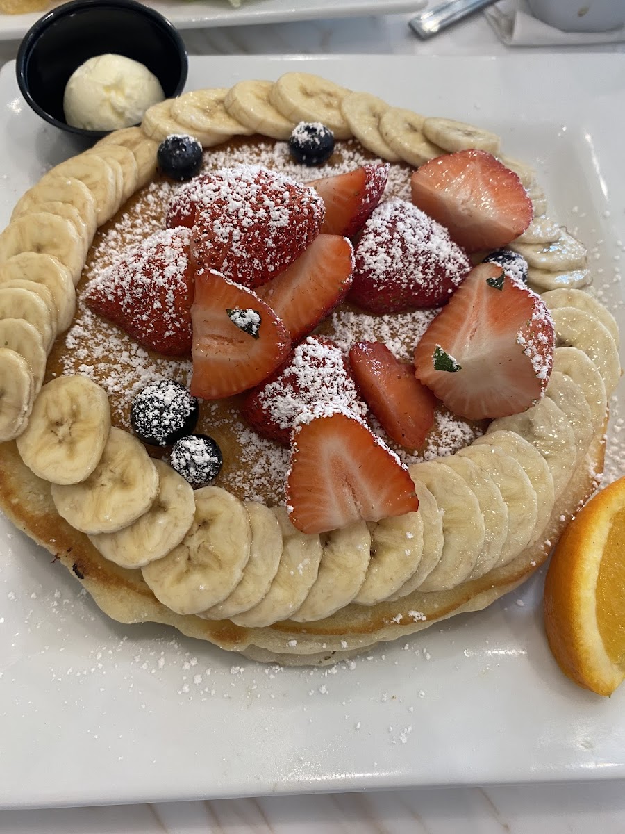 Florida Pancakes - stacks of pancakes topped with strawberries, bananas, blueberries and a dusting of powdered sugar.